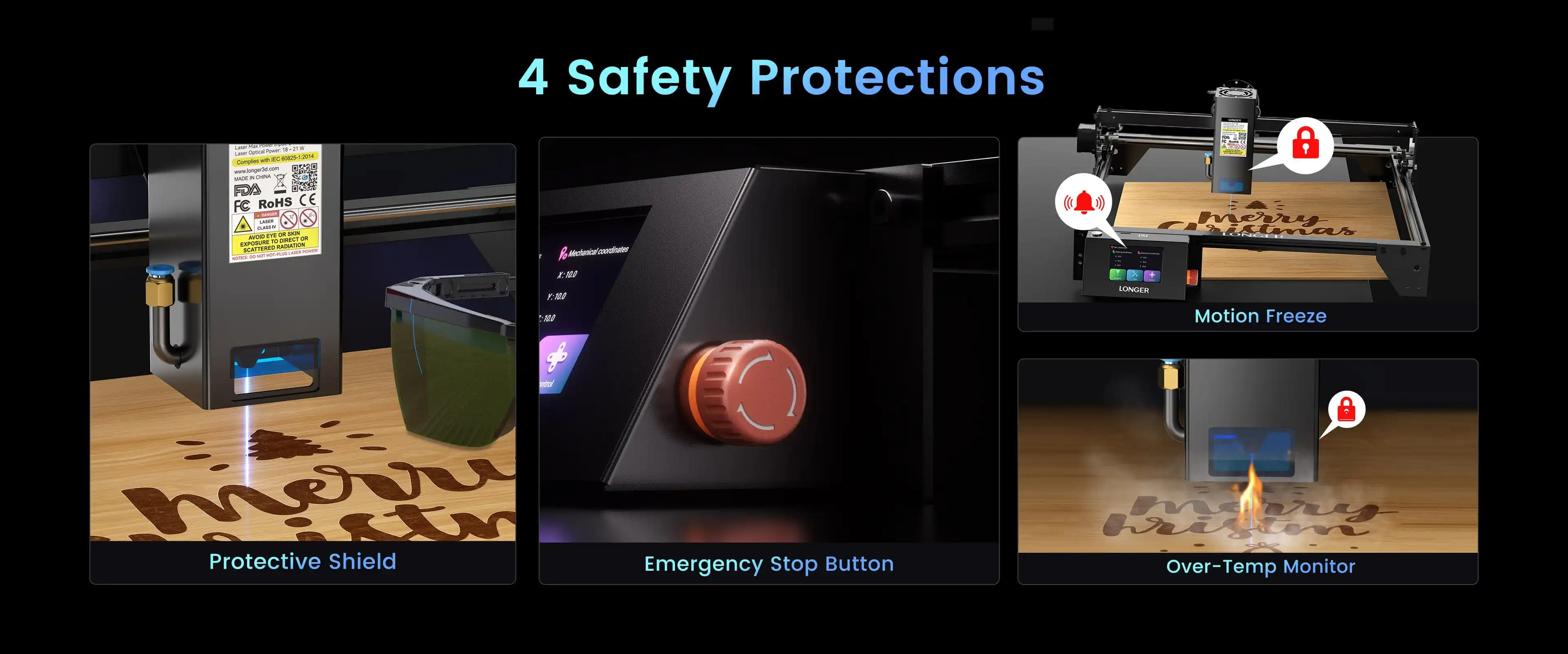 Dlhší laserový gravírovač RAY5 10W je navrhnutý s funkciami ochrany proti plameňu, ochrany proti pohybu a ochrany proti nehybnosti. Keď Ray5 počas práce zistí náhodný plameň, ochrana proti plameňu automaticky zastaví laser a spustí nepretržitý bzučiaci alarm. Keď je gravírovací stroj náhodne posunutý alebo naklonený, stroj sa automaticky vypne pre osobnú bezpečnosť. A laser sa automaticky vypne, keď je laserový modul zamrznutý viac ako 15 sekúnd.