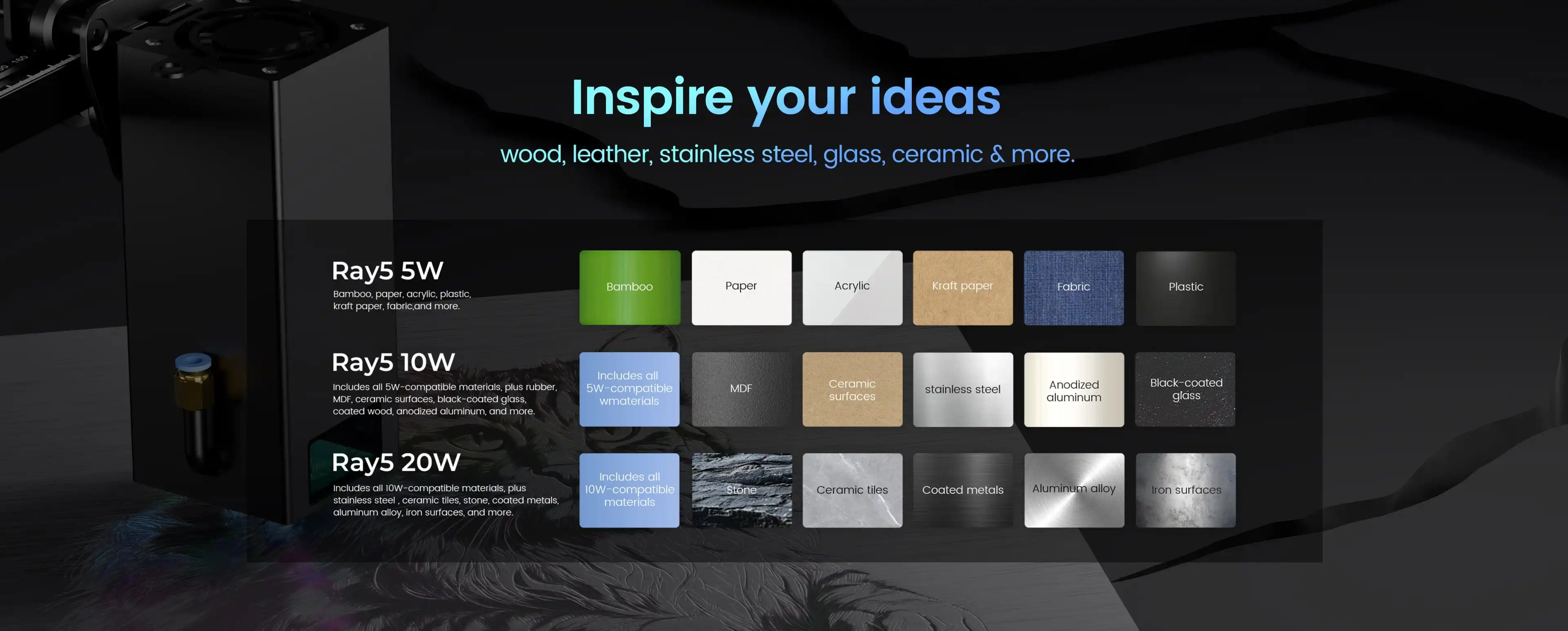 Ray5 10W s 3,5-palcovou dotykovou obrazovkou pridáva nové funkcie ako viac spôsobov prenosu dát a ovládanie viacerých strojov. V porovnaní s inými laserovými gravírkami dokáže gravírovať viac ako 1000 materiálov.