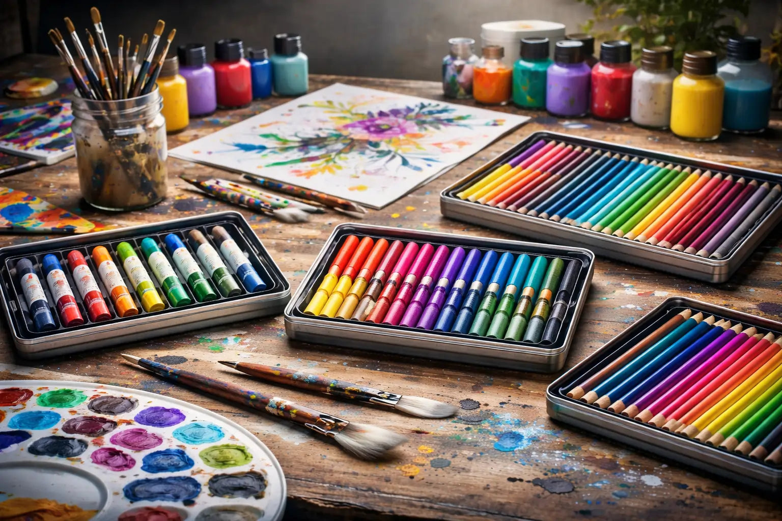 Bu koleksiyon, çizim, resim, el işi ve günlük sanatsal görevlerde kullanılan çeşitli yaratıcı araçlar ve aksesuarlar içerir.